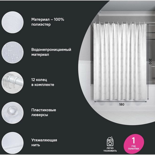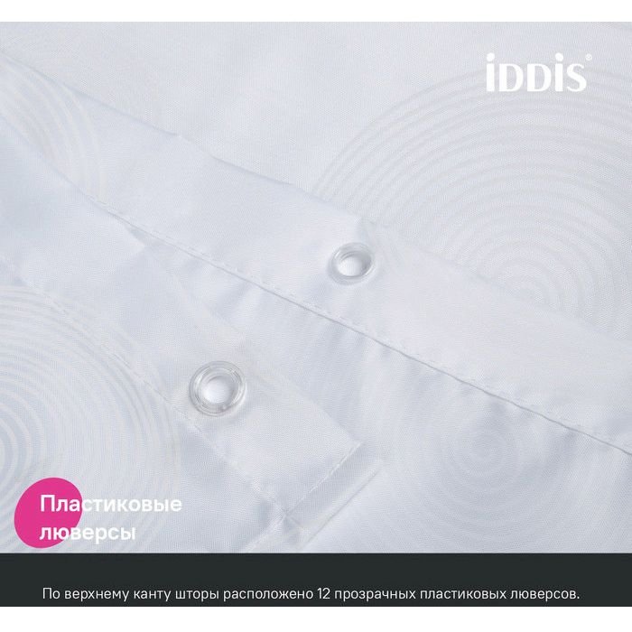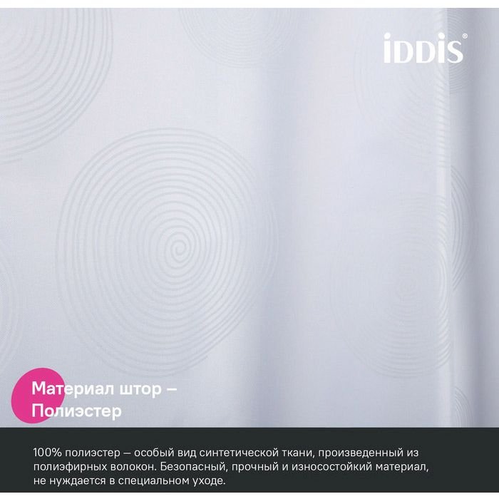Текстильная штора для ванной белого цвета с деликатным рисунком в виде кругов выглядит элегантно и подойдет к интерьеру в любом стиле и цветовой гамме. • Изготовлена из износостойкого полиэстера с водоотталкивающей пропиткой. При попадании на ткань вода не впитывается, а скатывается каплями, даже при сильном напоре воды. • В комплекте 12 колец С-формы из прозрачного пластика. • По верхнему краю расположены 12 прозрачных пластиковых люверсов. • Штора имеет утяжеляющую нить по нижнему краю, которая позволяет избежать задирания ткани. • Легко ухаживать: шторку для ванной комнаты можно стирать в стиральной машине в деликатном режиме и гладить утюгом на минимальной температуре. Гарантия на текстильные аксессуары Iddis® – 1 год. (с) Авторский текст, сентябрь 2023 г.