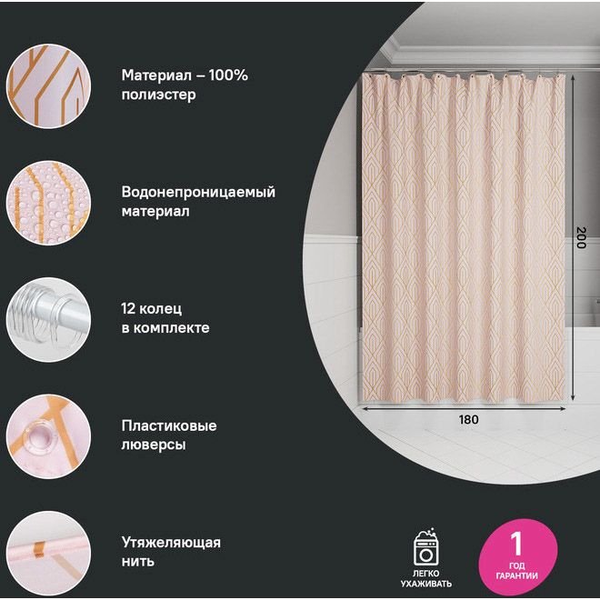 Текстильная штора для ванной теплого розового оттенка с крупным геометричным золотым узором в стиле ар-деко создаст утонченное элегантное настроение даже в самом простом интерьере. • Изготовлена из износостойкого полиэстера с водоотталкивающей пропиткой. При попадании на ткань вода не впитывается, а скатывается каплями, даже при сильном напоре воды. • В комплекте 12 колец С-формы из прозрачного пластика. • По верхнему краю расположены 12 прозрачных пластиковых люверсов. • Штора имеет утяжеляющую нить по нижнему краю, которая позволяет избежать задирания ткани. • Легко ухаживать: шторку для ванной комнаты можно стирать в стиральной машине в деликатном режиме и гладить утюгом на минимальной температуре. Гарантия на текстильные аксессуары Iddis® – 1 год. (с) Авторский текст, сентябрь 2023 г.