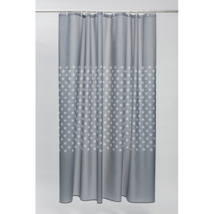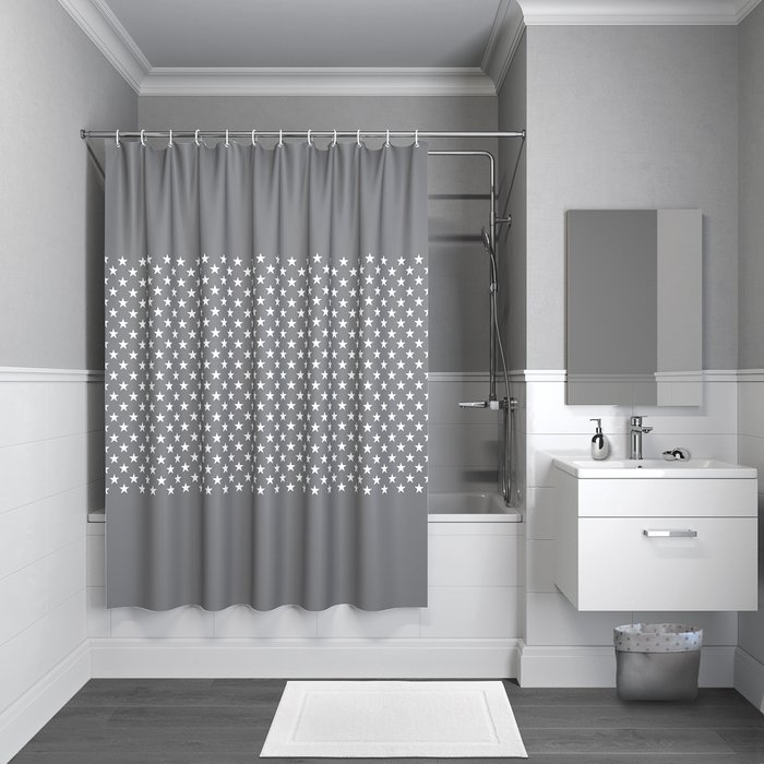Непрозрачная штора для ванной стильного серого оттенка с принтом из звезд в скандинавском стиле. Штора изготовлена из полиэстера с ребристой фактурой в виде тонких горизонтальных полос и деликатным блеском. Штора имеет прозрачные пластиковые люверсы и кольца в форме буквы С из белого пластика. Большой размер шторы позволит защитить ванную от брызг со всех сторон.