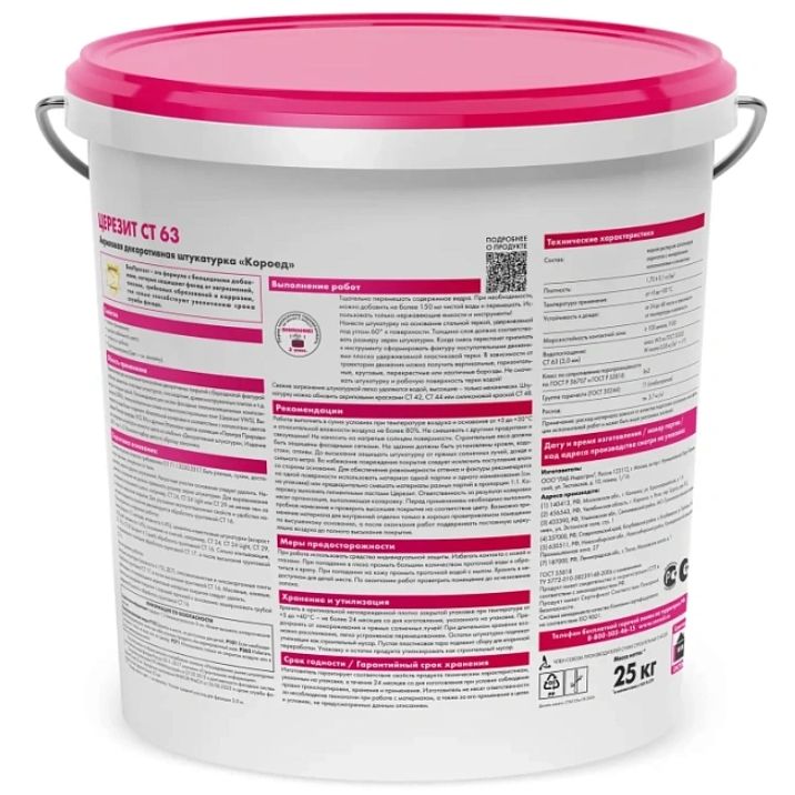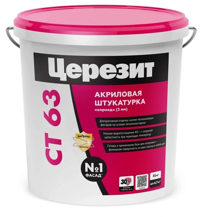 Ceresit Штукатурки CT 63 - сухие строительные смеси, предназначенные для изготовления декоративных тонкослойных штукатурных покрытий с фактурой «короед» при внутренних и наружных работах, в т.ч. при устройстве систем наружной теплоизоляции фасадов Ceresit VWS.