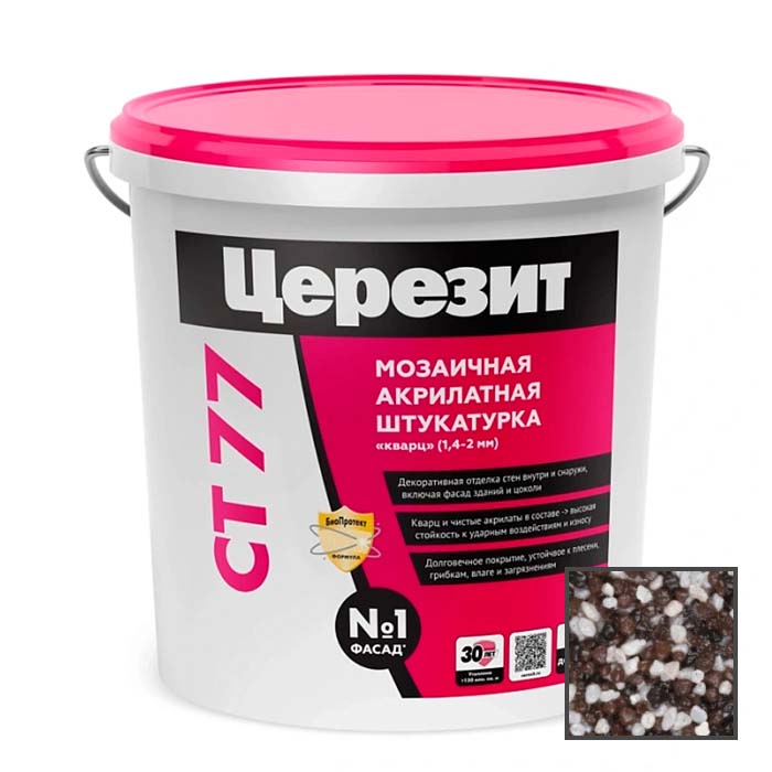 Ceresit CT 77. Акриловая декоративная штукатурка «мозаичная» 1,4-2,0 мм Тонкослойная штукатурка с зернистой фактурой из разноцветной каменной крошки 1,4-2,0 мм