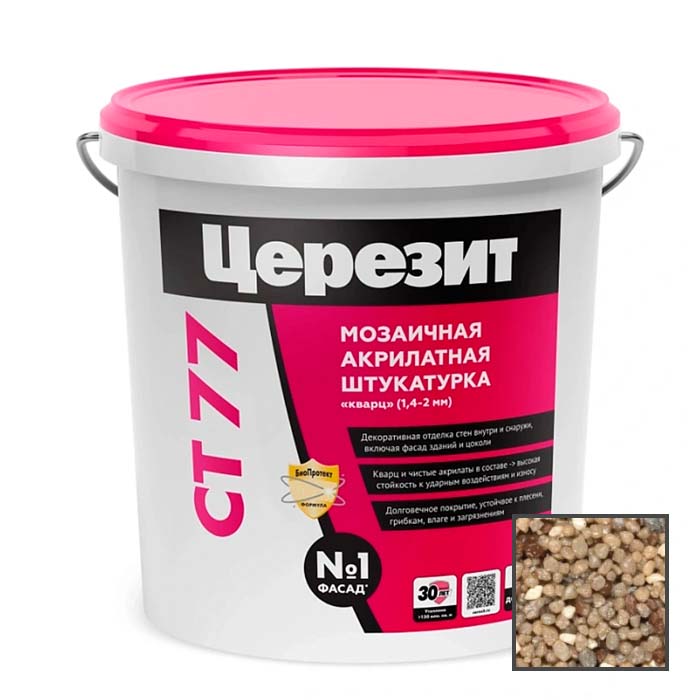 Декоративная штукатурка CT 77 предназначена для изготовления тонкослойных декоративных покрытий с «мозаичной» фактурой на бетоне, цементных и гипсовых штукатурках, гипсокартоне, древесностружечных плитах и т.д. внутри и снаружи зданий. Рекомендована для систем теплоизоляции фасадов с пенополистирольными плитами (Ceresit VWS). Имеет зернистую фактуру из разноцветной кварцевой или мраморной (с маркировкой «М») крошки. После высыхания представляет собой стекловидное, очень прочное, стойкое к загрязнению и истиранию покрытие, способное перекрывать мелкие трещины, и применяется в коридорах, холлах, входных группах, на лестничных клетках, цоколях, парапетах и т.д.