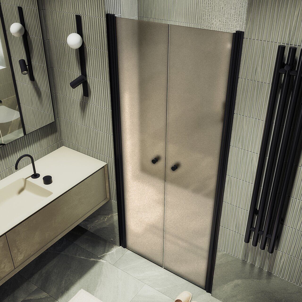 - Эстетика и стиль: Матовая бронза придаёт двери утончённый вид, который легко вписывается в любой дизайн ванной комнаты.
