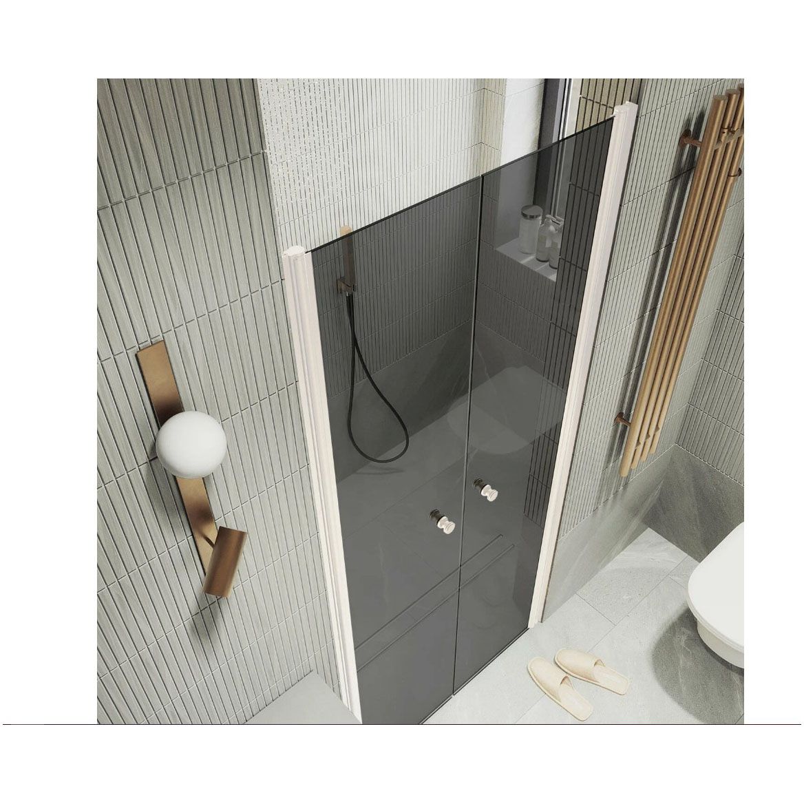 - Удобство эксплуатации: Двустворчатая конструкция позволяет легко заходить и выходить из душевой, а также обеспечивает комфортный доступ к пространству.
