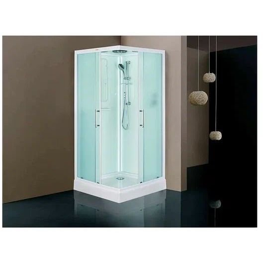 Низкий поддон. Сифон с гидрозатвором. Стекло: 5 мм, переднее - "матовое". заднее - "белое крашеное" с интегрированным зеркалом 60х30. Встроенная LED подсветка. Профиль: алюминий. Цвет: БЕЛЫЙ. На кабинах установлены: панель управления, вытяжной вентилятор, верхний душ с резиновыми соплами, FM радио. Комплектующие: стеклянная крыша, полочка со стаканчиком, смеситель, 3-х режимная лейка на стойке, мыльница, двойные ролики. Модель: "СКR" - квадратная.