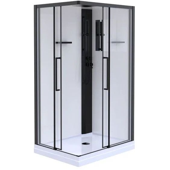 Низкий (125мм) поддон с бортиками по периметру. Съёмный экран высотой 75мм. Сифон с гидрозатвором. Лицевые прозрачные стекла (5 мм) с покрытием Easy Clean. Задние стенки - "супербелое" крашенное стекло (5мм), покрытое защитной плёнкой. Замковое соединение профилей. Профиль алюмииевый (черный матовый). Функциональноая панель из ПВХ. Душевая лейка с регулируемым держателем. Двойные (спаренные) верхние ролики, внизу блок скольжения. Крыша - "супербелое" крашенное стекло (6мм), покрытое защитной плёнкой. Верхний душ из нержавеющей стали.