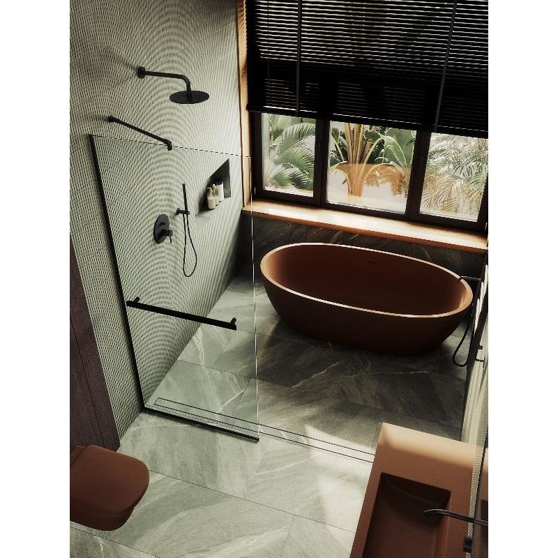 Закаленное стекло , цвет бесцветный , толщина 8 мм , 1950*1090-1 шт. Профиль П-образный , цвет черный-2 шт. Штанга стена-стекло -1 шт. Полотенцедержатель -1 шт. Комплект крепежа-1 шт. Инструкция по монтажу-1 шт.