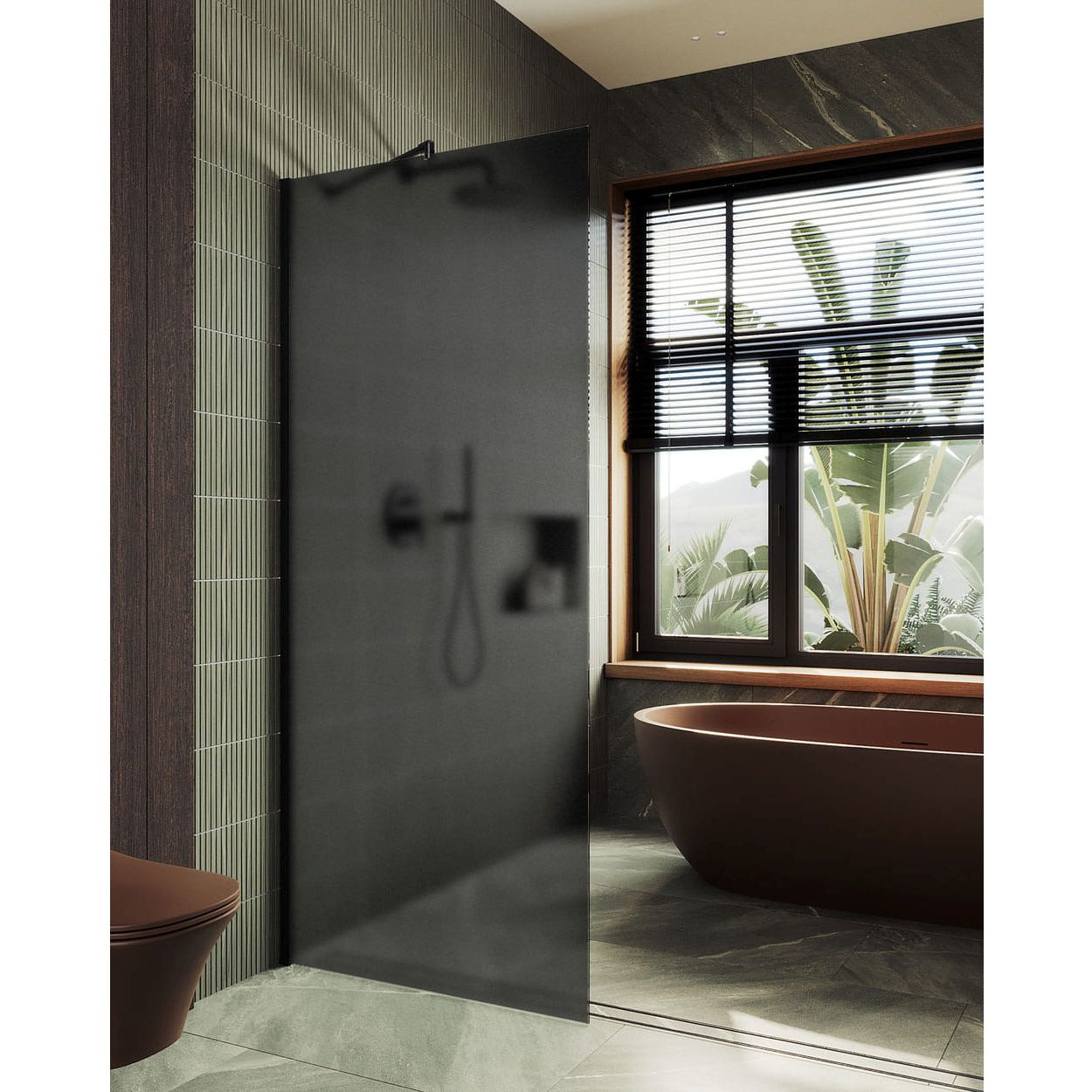 Перегородка выполнена из высококачественного графитового матового стекла, что добавляет элегантности и современности вашему интерьеру. Матовая поверхность не только выглядит стильно, но и предотвращает образование видимых пятен и следов от воды, облегчая уход за изделием.