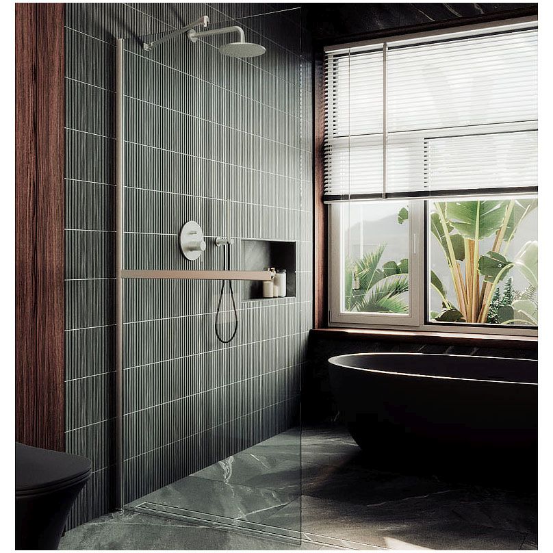 Изготовленная из прочного бесцветного стекла толщиной 8 мм, перегородка обеспечивает не только безопасность, но и визуальную легкость в интерьере. Бесцветное стекло создает эффект открытого пространства, позволяя естественному свету проникать в душевую зону, что делает её более светлой и просторной.