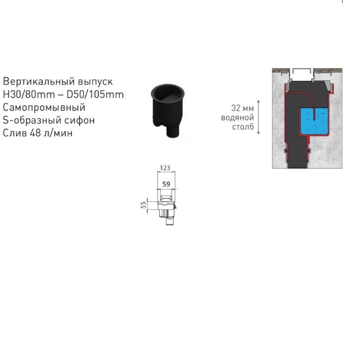 Горизонтальный выпуск D50 H60, пропускная способность 42л/мин, монтаж 360°