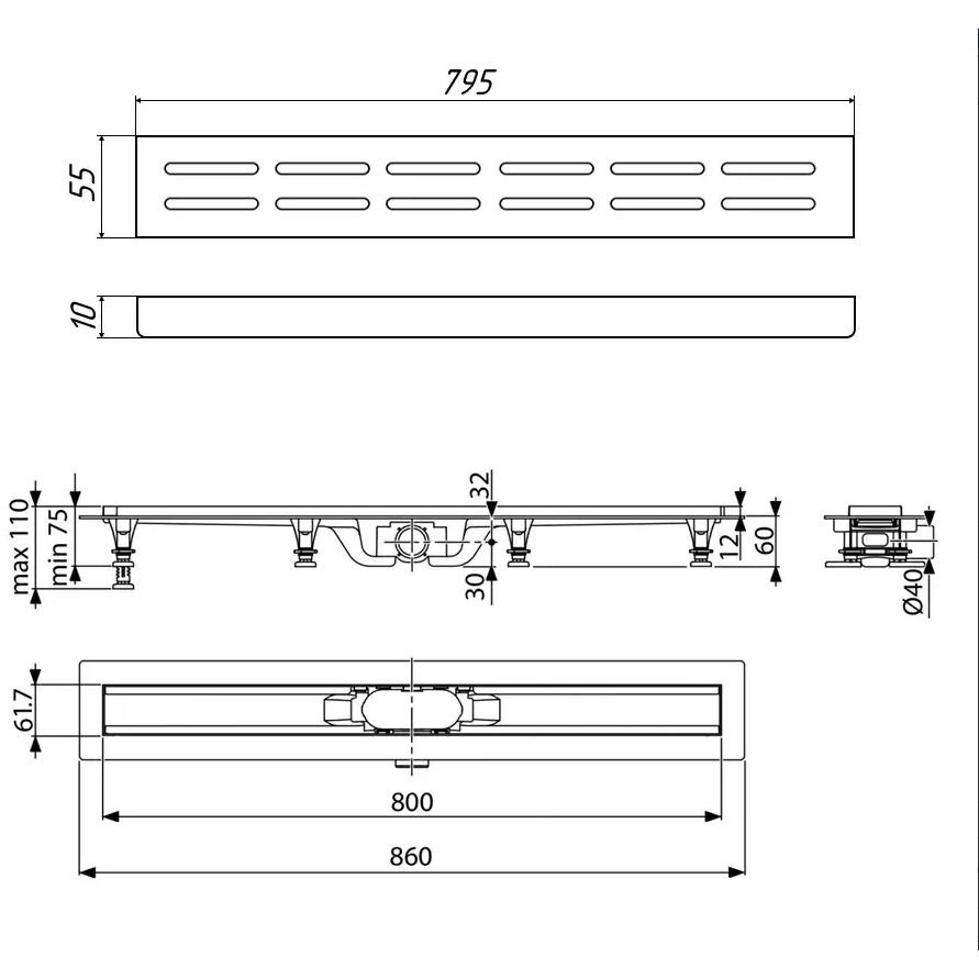 Комплектация:пластиковый водоотводящий желоб с порогами из нержавеющей стали; встроенный сифон DN40, выход вбок 90 град.; встроенный шариковый сухой затвор; декоративная вставка; комплект регулируемых опор; улавливатель волос и мусора; гидроизоляционная лента; сервисный ключь. p>