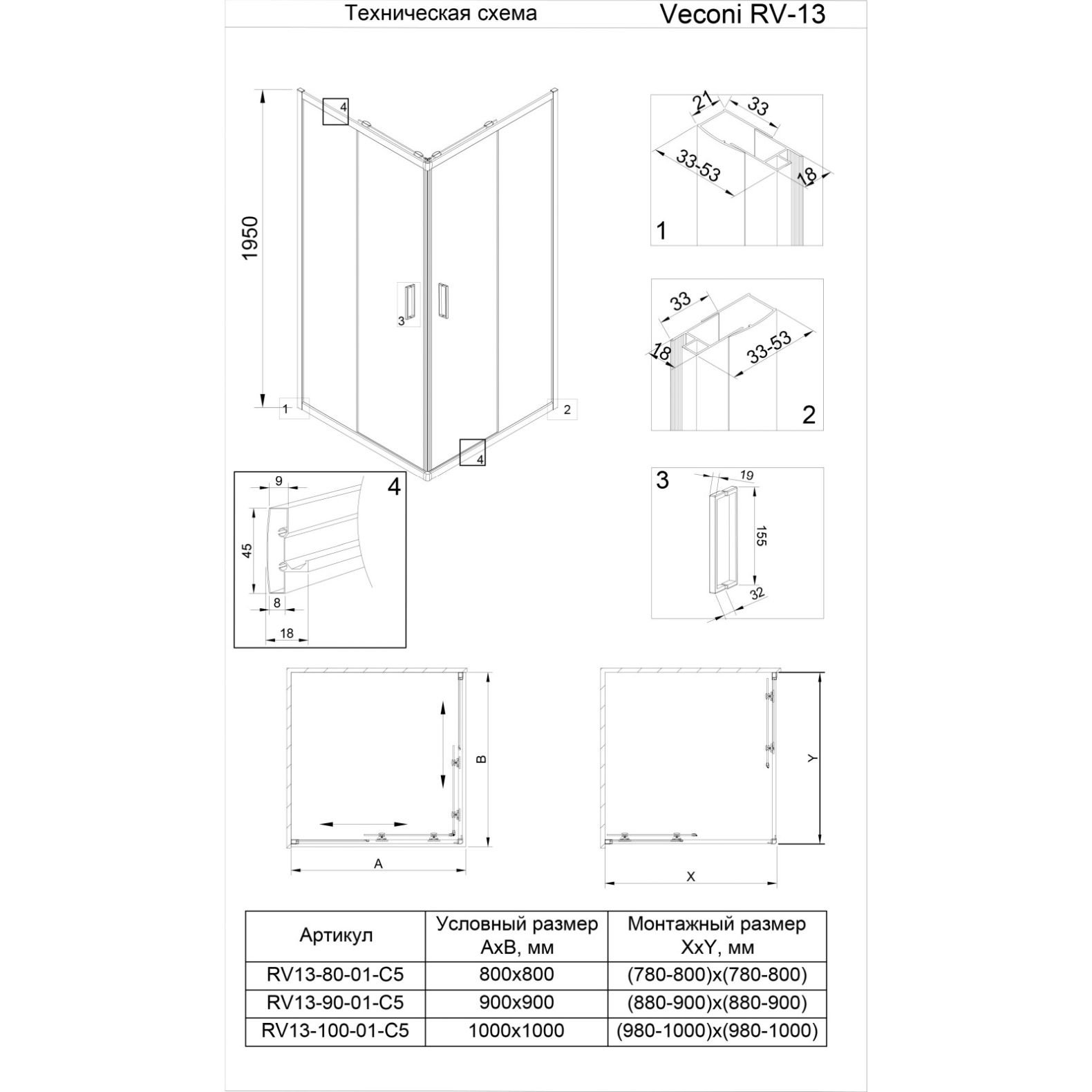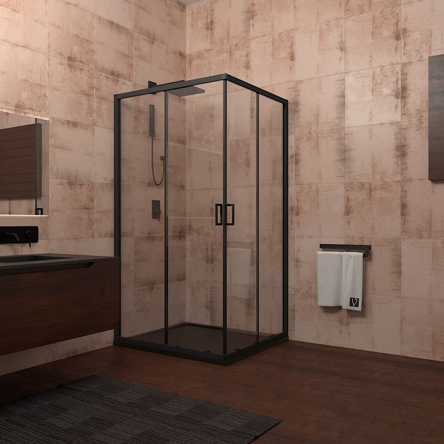 Душевой уголок Veconi (Векони) Rovigo 90х195х90 см стекло прозрачное, профиль черный, механизм раздвижной (RV13-90-01-C5)