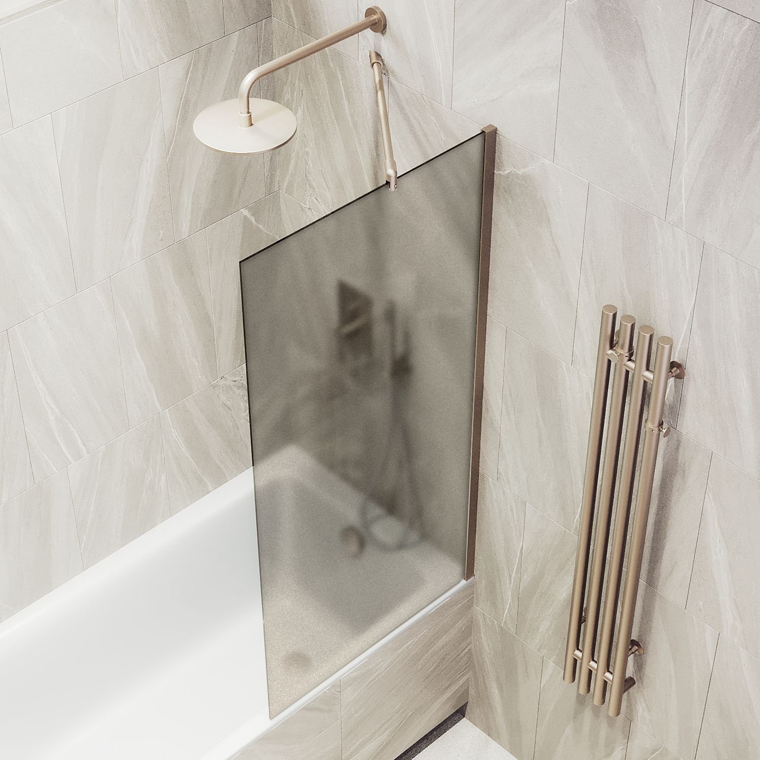 Закаленное стекло, цвет Бронза матовая, толщина 8 мм 1400х700 мм - 1 шт. Профиль П-образный, цвет Бронза- 1 шт. Комплект крепежа - 1 шт. Уплотнитель – 1 шт. Герметик силиконовый санитарный, бесцветный - 1 шт. Инструкция по монтажу - 1 шт.