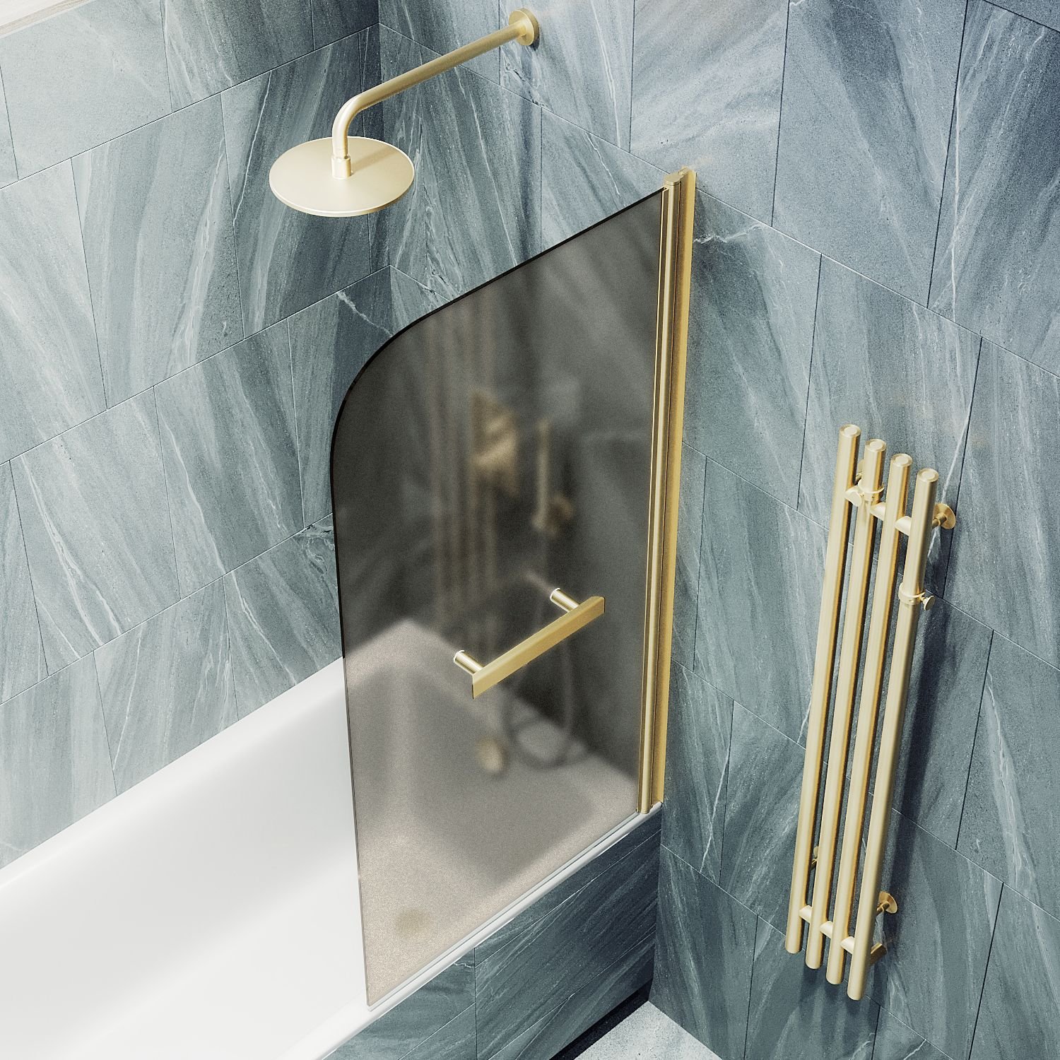 Закаленное стекло, цвет бронза матовое, толщина 6 мм 1400х540 мм - 1 шт. Монопетля, цвет золото- 1 шт. Комплект крепежа - 1 шт. Уплотнитель – 1 шт. Полотенцедержатель- 1 шт. Инструкция по монтажу - 1 шт.