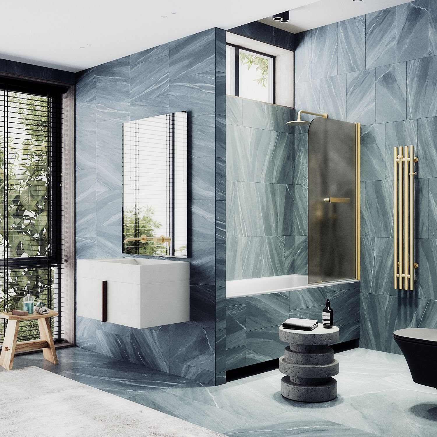 Закаленное стекло, цвет бронза матовое, толщина 6 мм 1400х640 мм - 1 шт. Монопетля, цвет золото- 1 шт. Комплект крепежа - 1 шт. Уплотнитель – 1 шт. Полотенцедержатель - 1 шт. Инструкция по монтажу - 1 шт.