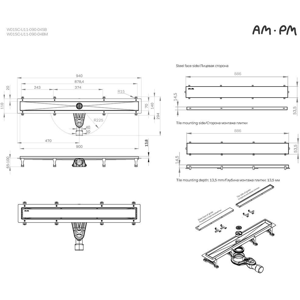 Трап для душа Am.Pm (Ам.Пм) MasterFlow линейный универсальный затвор Tile 90см цвет сталь матовый W01SC-U11-090-04SB