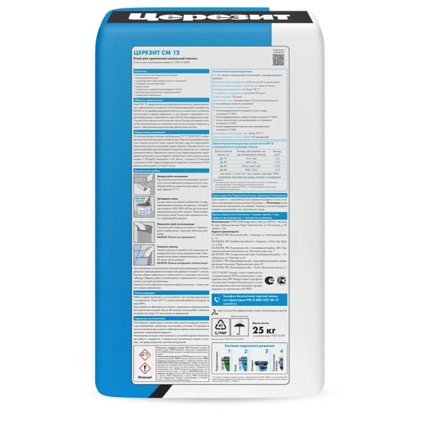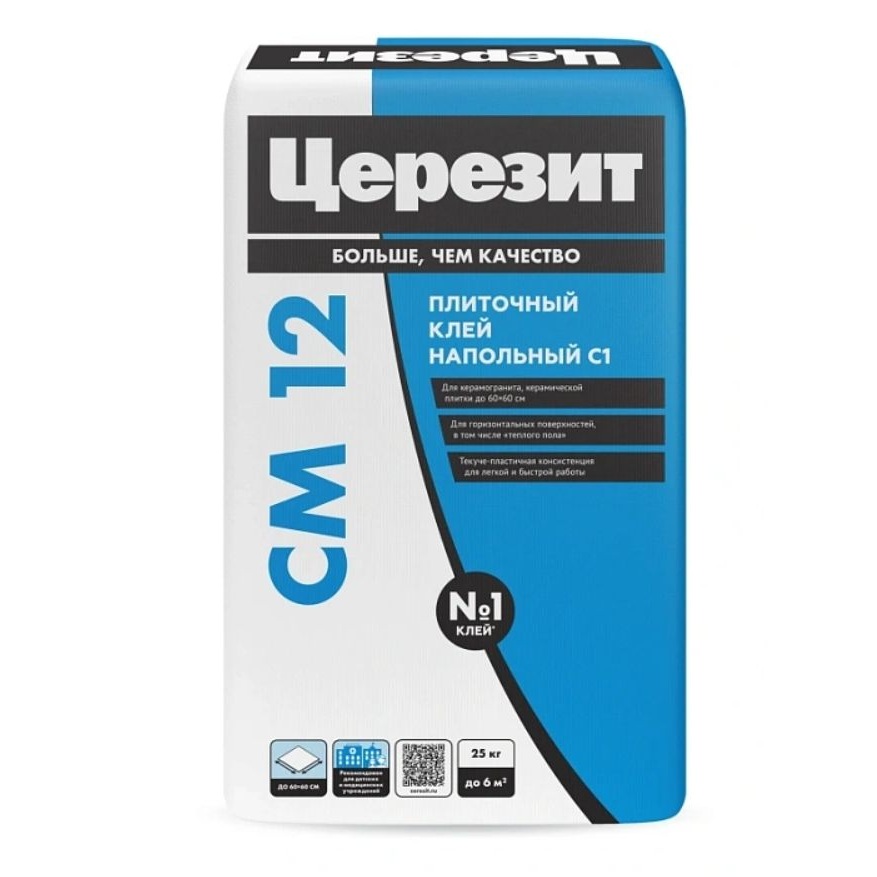 Клей Ceresit СМ 12 - сухая смесь, предназначенная для крепления всех видов минеральных плиток (керамогранитных, каменных, клинкерных, керамических и т.п.), в т.ч. крупноформатных (форматом до 60х60 см), на горизонтальных минеральных недеформирующихся основаниях (бетонных и цементно-песчаных) внутри зданий, в гражданском и промышленном строительстве.