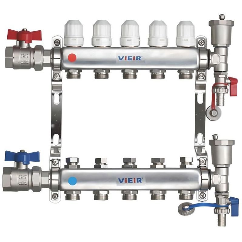 Корпус коллектора ViEiR производят из латуни CW617N покрытой для дополнительной защиты слоем никеля. Представляет собой проходной коллектор с наружней и внутренней резьбой на 1". Соединение фитингов осуществляется на уплотнителях выполненных из EPDM резины, что значительно упрощает сборку и монтаж. Коллекторы оснащены отверстиями на 9 выходов диаметром 3/4" под евроконус. Коллекторная группа оснащена воздухоотводчиком с терминальным узлом, который представляет собой прибор для автоматического удаления газов, объединенный в одном узле с краном для слива или наполнения жидкостью системы.