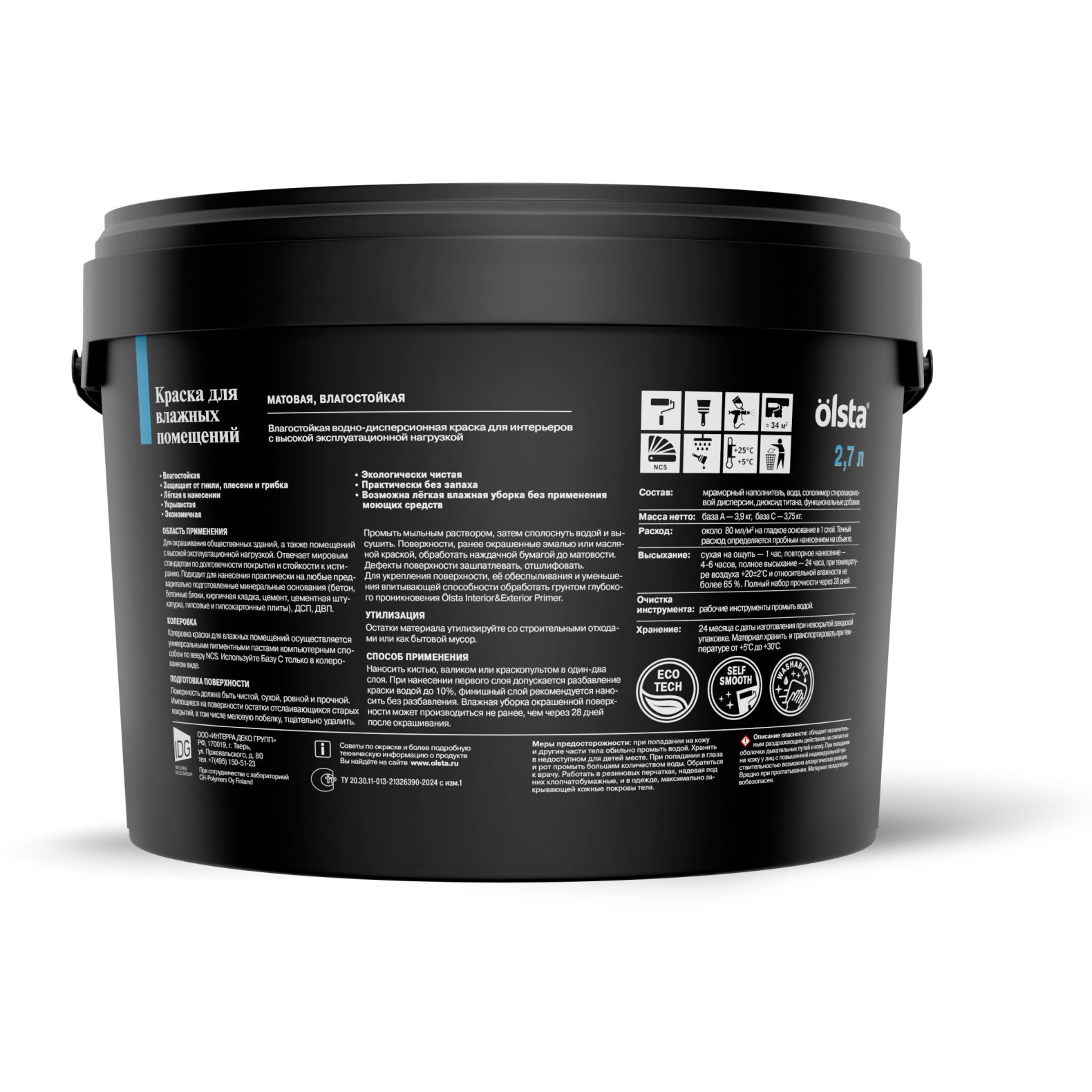 Краска для влажных помещений Olsta (Ольста) Practic Матовая Белая база A 2,7 л