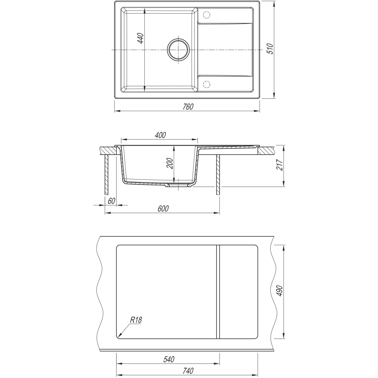 Кухонная мойка ТЕХНО 760 . Классическая мойка с увеличенным крылом; Вместительная чаша; Модель оборачиваемая.