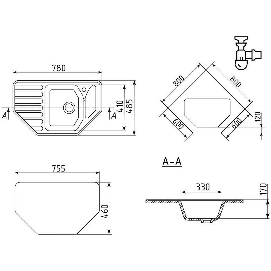 Мойка кухонная Ulgran (Улгран) из искусственного мрамора многоугольная U-109, цвет: ультра-черный, база: 75.5х46 см, арт. U-109-344