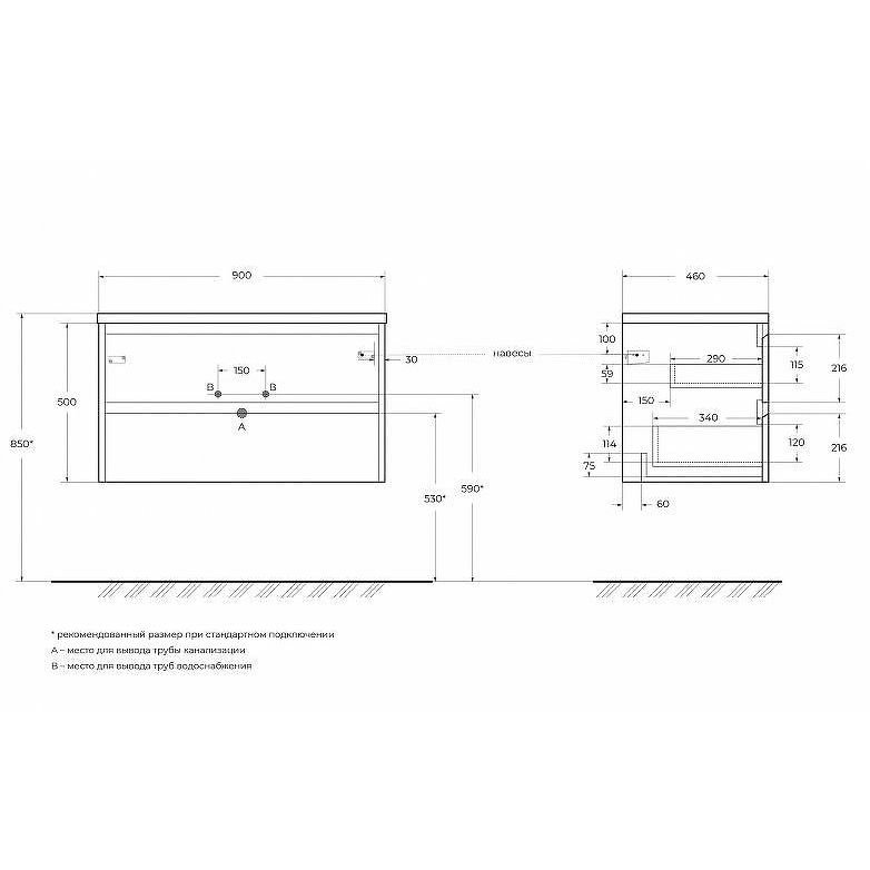 База под раковину подвесная BelBagno (Бельбагно) KRAFT с двумя выкатными ящиками Cemento Grigio 900x460x500 KRAFT-900-2C-SO-CG