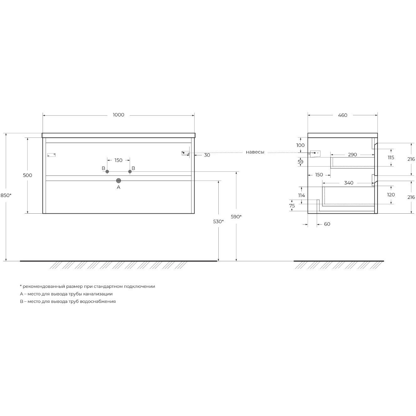 База под раковину подвесная BelBagno (Бельбагно) KRAFT с фрезерованными ручками по всей длине фасада с двумя выкатными ящиками Pino Pasadena 1000x460x500 KRAFT-1000-2C-