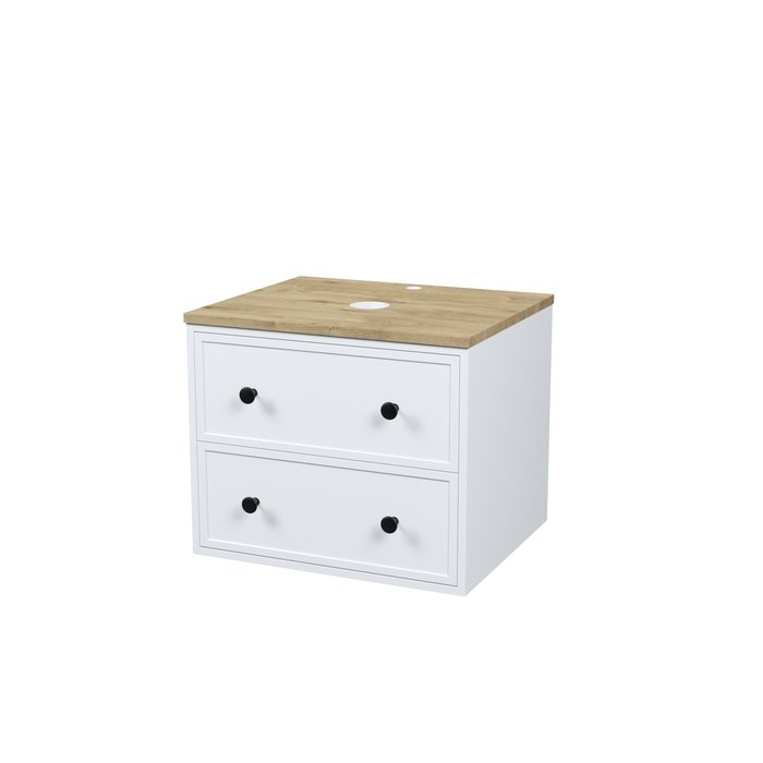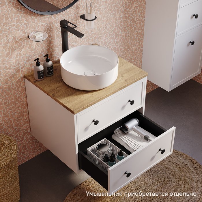 Компактная подвесная тумба Torr классического молочно-белого цвета со столешницей из МДФ в оттенке дуба верона. Сочетает в себе узнаваемый стиль и практичность популярного скандинавского дизайна. Ее четкие формы, теплый цвет дерева, фасады с декоративной филенкой, круглые ручки смотрятся гармонично и впишутся в любой современный интерьер. Подойдет любой накладной умывальник, покупается отдельно.