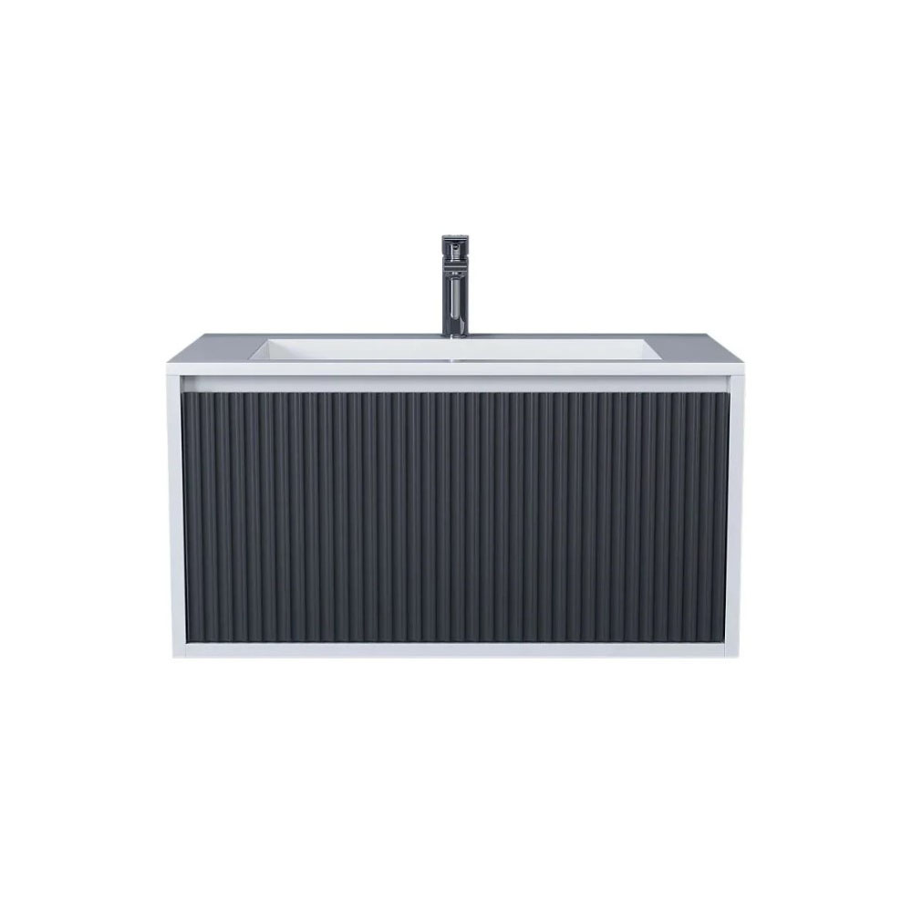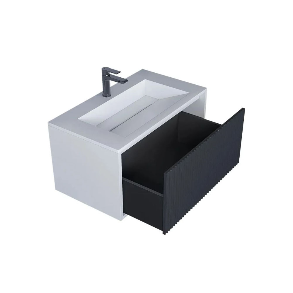 Подвесная тумба под раковину Uperwood Next Premium шириной 80 см с боковинами белого матового цвета и фасадом в цвете "графит" оснащена одним выдвижным ящиком.