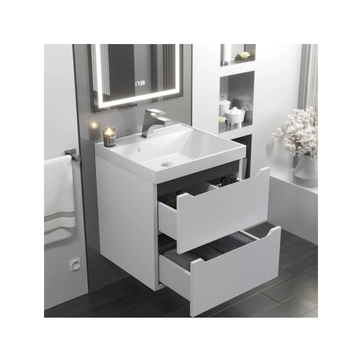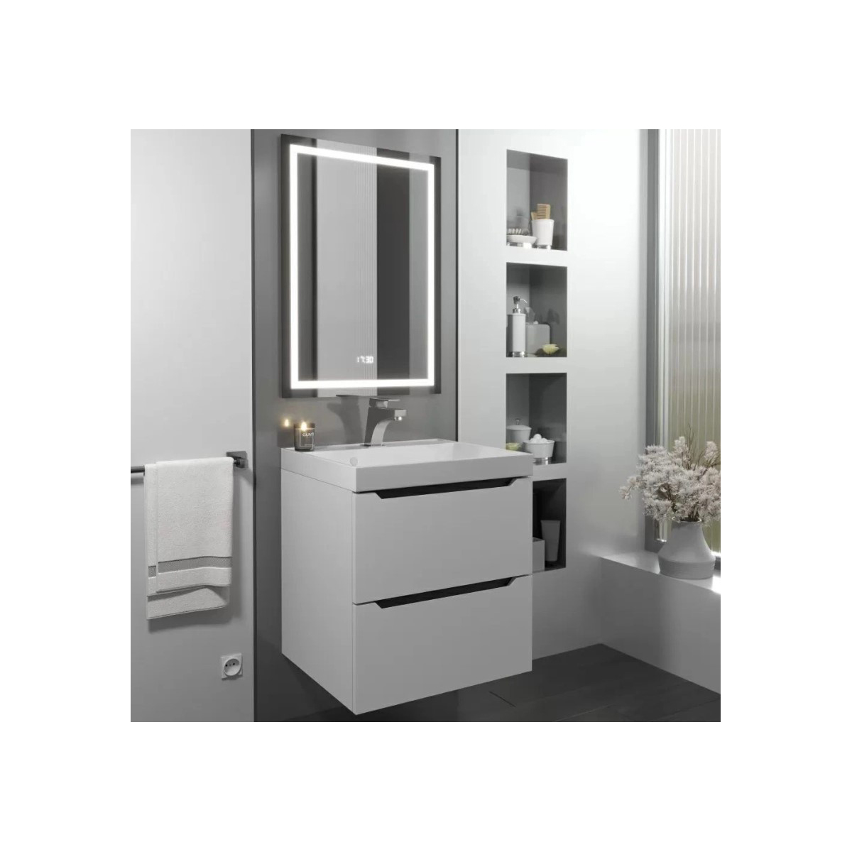 - Современный стиль: Матовая белая поверхность в сочетании с графитовыми элементами добавляет изысканности и элегантности вашему интерьеру.