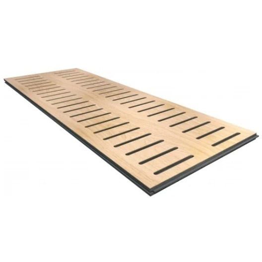 По лицевой стороне панели щелевая перфорация Line 10 - удлиненные пропилы размером 90 мм с шагом 46 мм. Вдоль линий внешней перфорации выполнены несквозные круглые отверстия. Панели эффективно поглощают звук, обеспечивая высокую степень акустического комфорта.