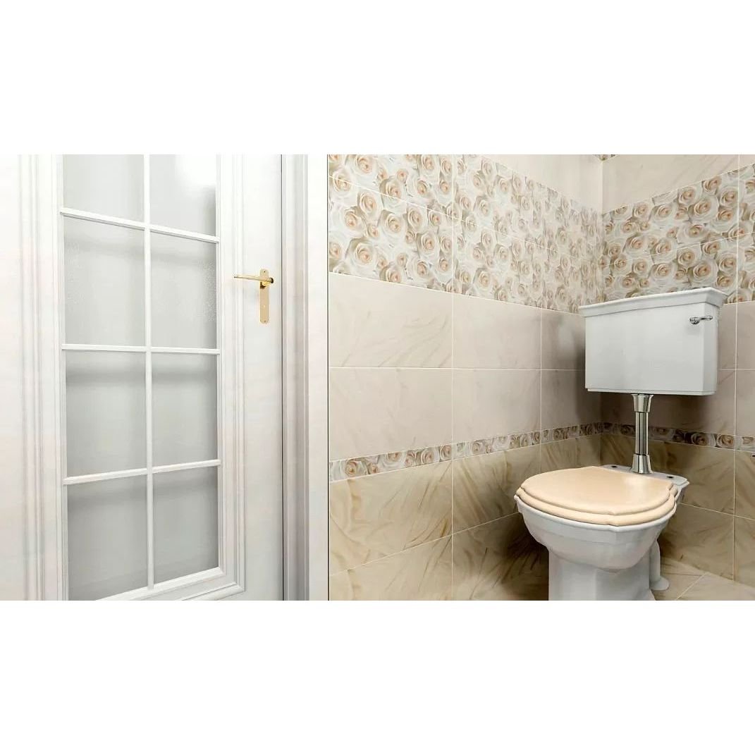 Белорусская, глянцевая плитка Камелия бордюр 54х500 прямоугольной формы, размера 5.4x50, бежевого цвета. Данный вид плитки, с цветочным рисунком, подойдет для бордюра Вашей ванной.