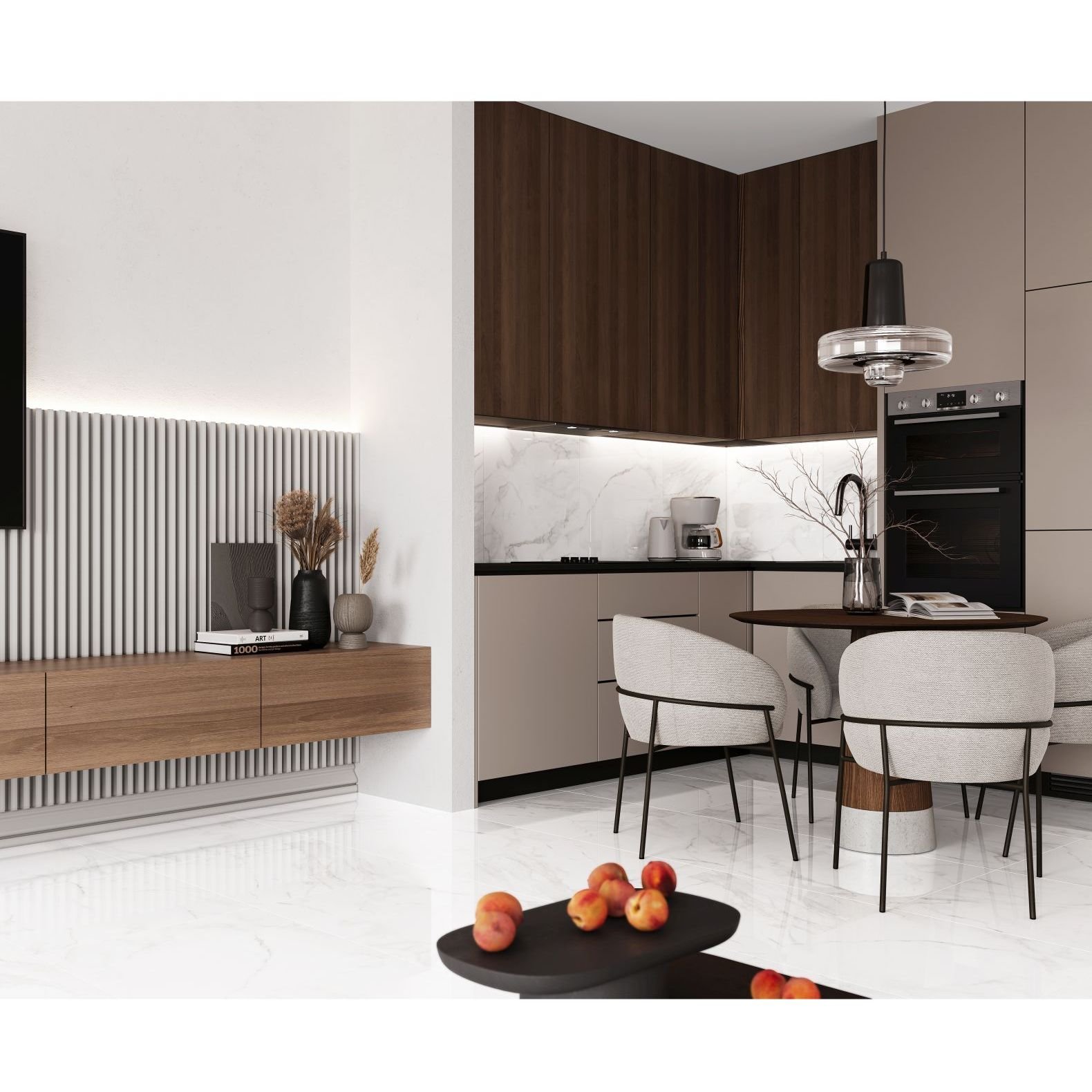 Calacatta Faro Grey отлично сочетается с различными стилями интерьера – от классического до современного минимализма. Его светлая палитра и мягкие серые вкрапления позволяют создавать гармоничные комбинации с мебелью и декором. Используйте этот керамогранит для создания акцентных стен, напольных покрытий или в качестве облицовки для каминов и барных стоек.