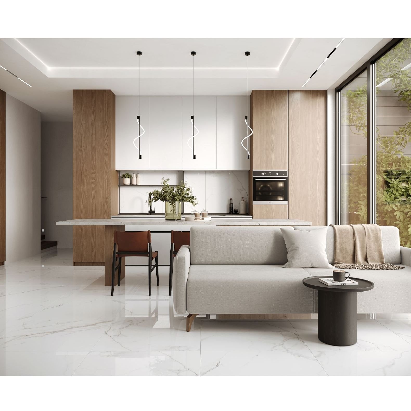 Основной цвет плитки – белый, что позволяет использовать ее в различных интерьерах, создавая эффект легкости и воздушности. На поверхности керамогранита можно заметить тонкие серые прожилки, которые придают ему уникальный характер и делают его похожим на натуральный мрамор. Это отлично подходит как для жилых, так и для коммерческих помещений, добавляя нотку роскоши и стиля.