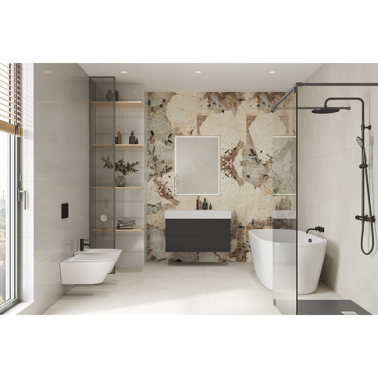 Каменные текстуры сложных оттенков и с выразительным рисунком прожилок смотрятся действительно оригинально как в современных, так и в классических интерьерах. Если вам важно добавить в интерьер нотки респектабельности и аристократического шика, обратите внимание на текстуры амазонита, оникса, мрамора и камня редкой горной породы брекчия. Инновационные технологии воспроизводят натуральные породы камня максимально реалистично благодаря цветопередаче и точным рисункам текстур. Поэтому керамогранит под камень иногда оказывается не только доступнее, но и долговечнее натурального материала. Он не впитывает загрязнения, устойчив к ударам, истиранию и другому механическому воздействию. Керамогранит Sunhearrt имеет крупный формат 80х160 см, что позволяет создать на полу и стенах монолитную каменную поверхность с минимальным количеством стыков, а также использовать целую плиту для отделки фартука, столешницы и других поверхностей.