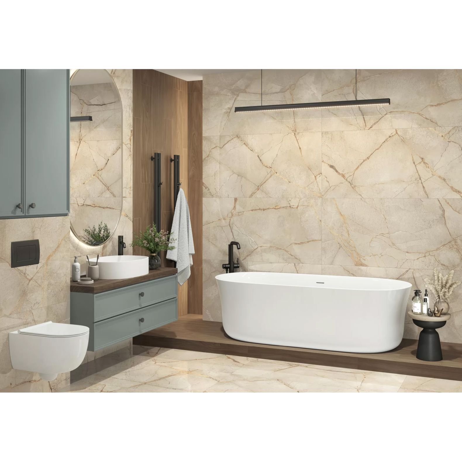 - Цвет: Бежевый с нежными мраморными вкраплениями, что придаёт пространству светлое и воздушное ощущение.