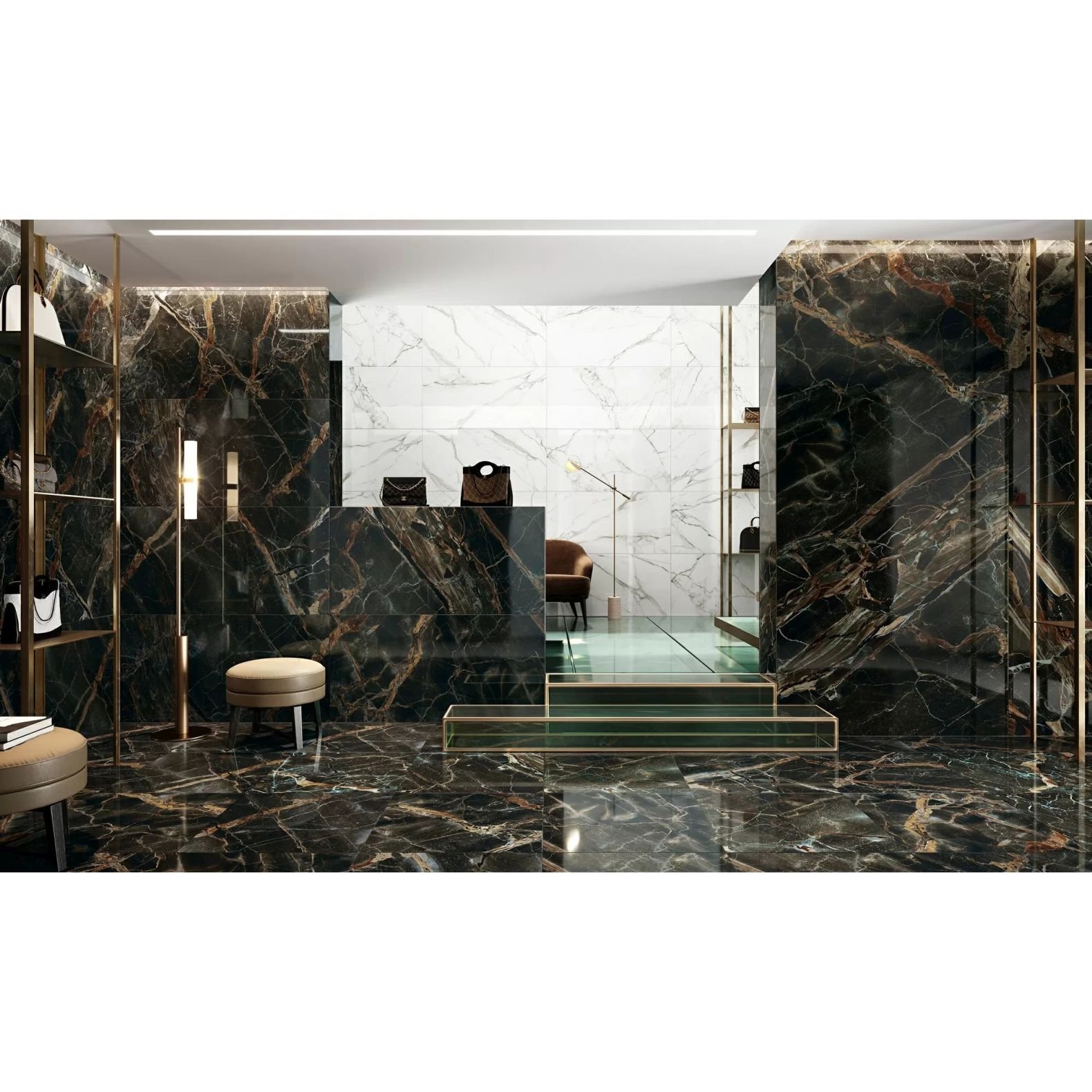 Ректифицированный керамический гранит RHAPSODY CARAVAGGIO GOLD LEV RET 120X260 фабрики NAXOS черного цвета с золотыми прожилками. Поверхность полированная. Имитация мрамора. Подходит для облицовки стен и укладки на пол. Продается кратно коробкам.