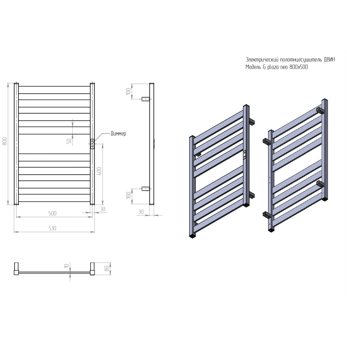 Полотенцесушитель электрический Двин (Dveen) G plaza neo 80х50 см, без полки, К диммер, квадрат черный матовый