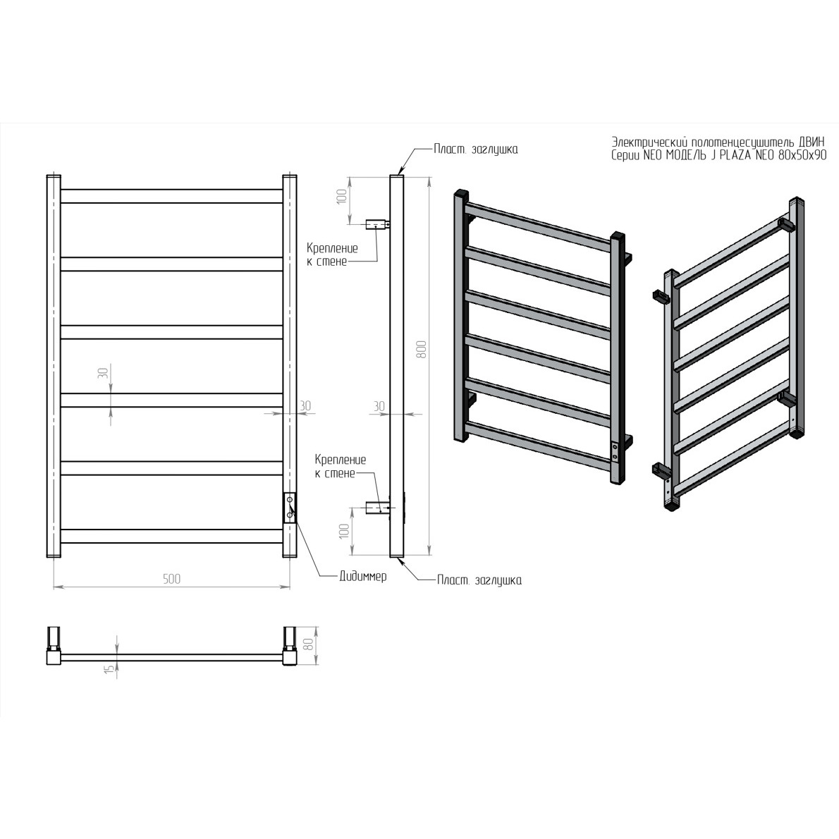 Полотенцесушитель электрический Двин (Dveen) J plaza neo 80х50 см, без полки, К диммер, квадрат полированный хром