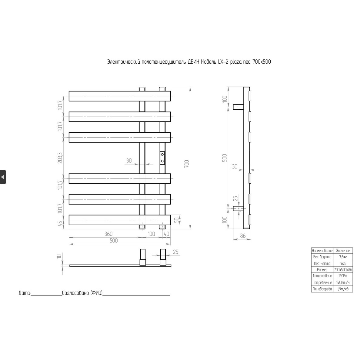 Полотенцесушитель электрический Двин (Dveen) LX-2 plaza neo 70х50 см, без полки, К диммер, квадрат графит