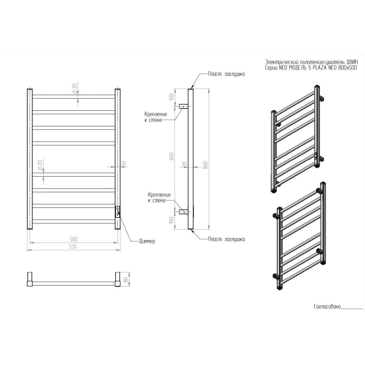 Полотенцесушитель электрический Двин (Dveen) S plaza neo 80x50 см, без полки, К диммер, квадрат черный матовый