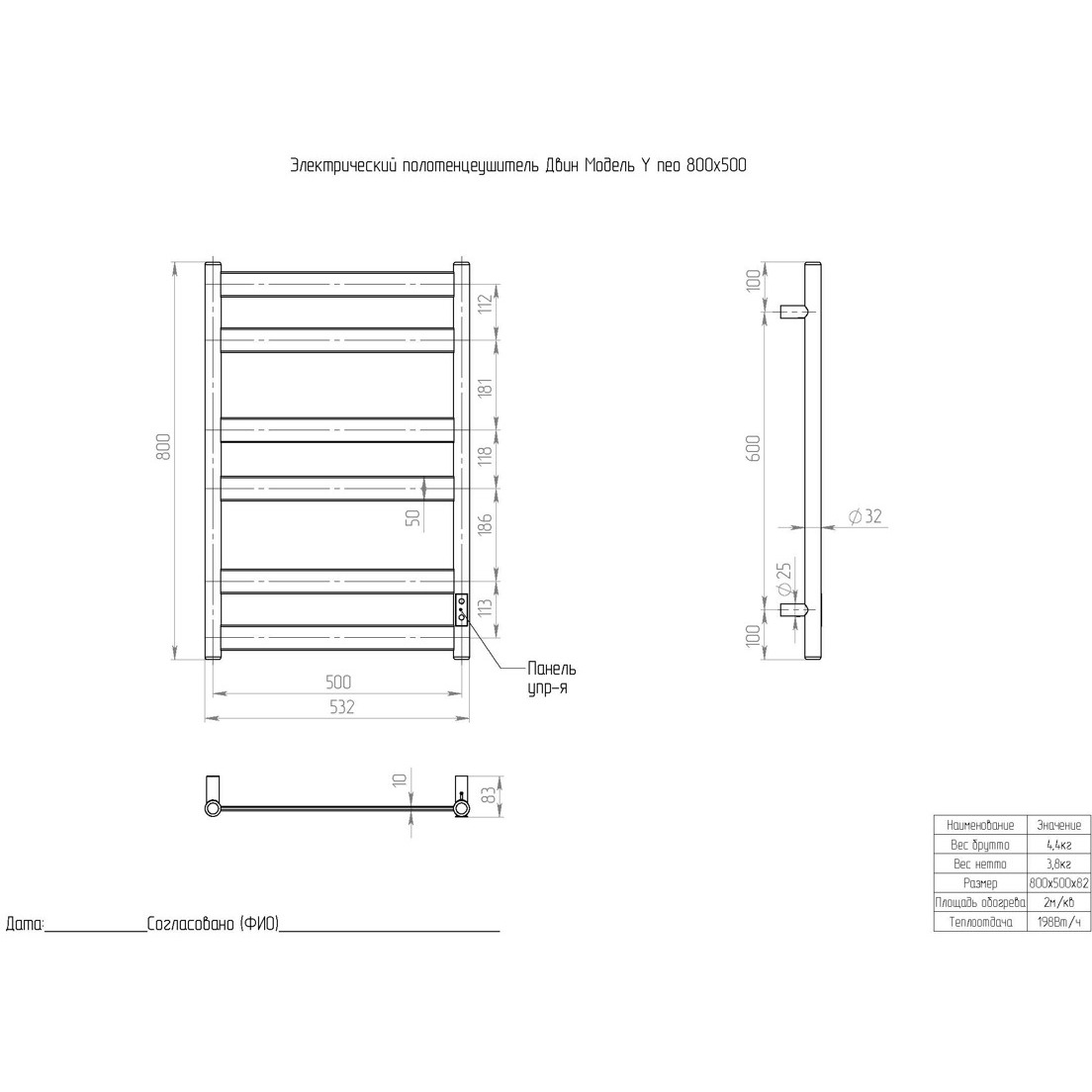 Полотенцесушитель электрический Двин (Dveen) Y neo 80х50 см, без полки, К диммер графит