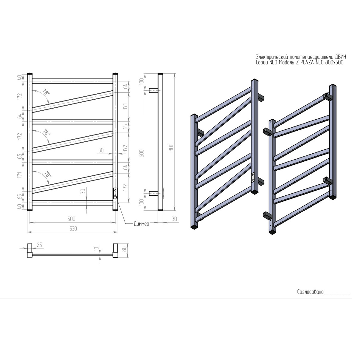 Полотенцесушитель электрический Двин (Dveen) Z plaza neo 80х50 см, без полки, К диммер, квадрат белый
