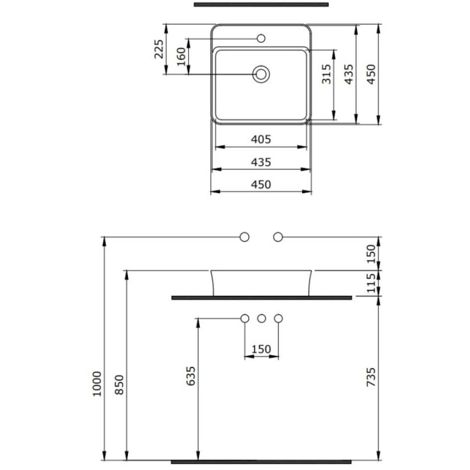 Квадратной формы, с отверстием под смеситель, матовый серый.