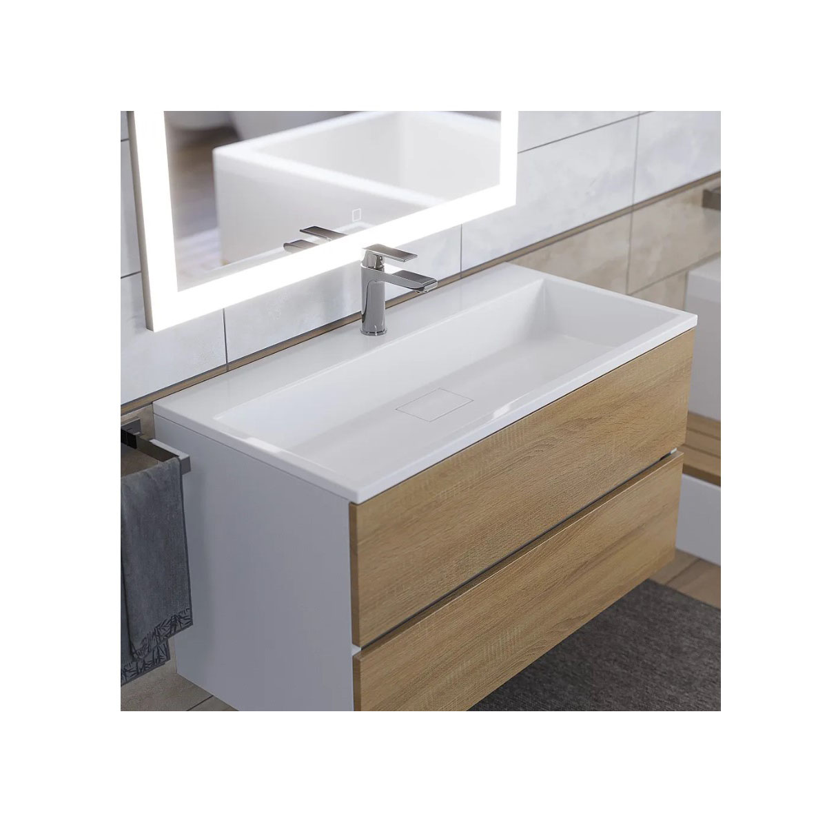 Комплект из тумбы с раковиной можно дополнить настенным зеркалом для ванной с подсветкой Uperwood Barsa подходящей ширины и подвесным шкафом-пеналом для ванной Uperwood Barsa белого (арт. 293020529) или черного цвета (арт. 293020545)