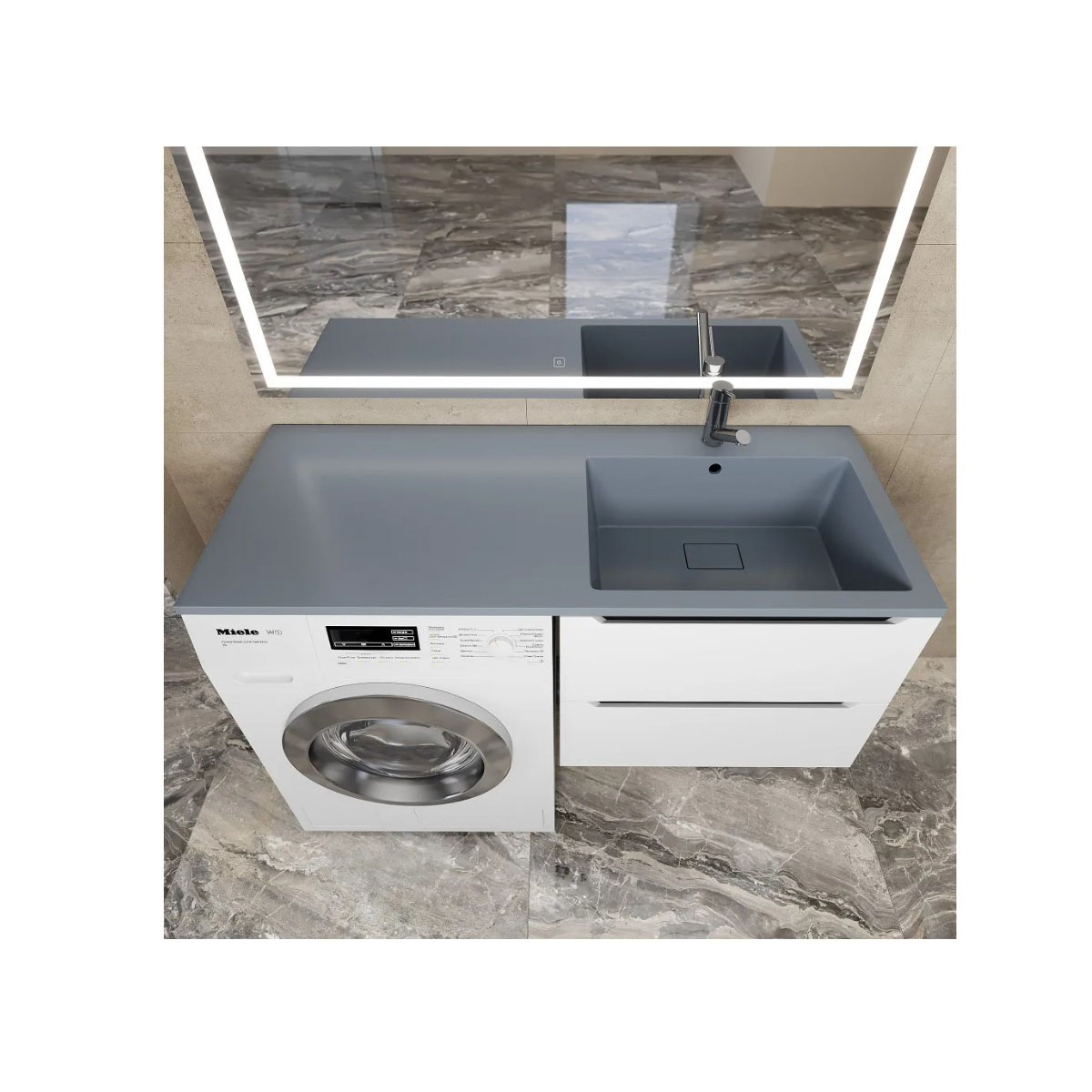 Раковина над стиральной машиной от бренда Uperwood из коллекции Cosmos шириной 120 см (120х48х17,2 см) с декоративной накладкой для слива изготовлена из кварцевого композита.
