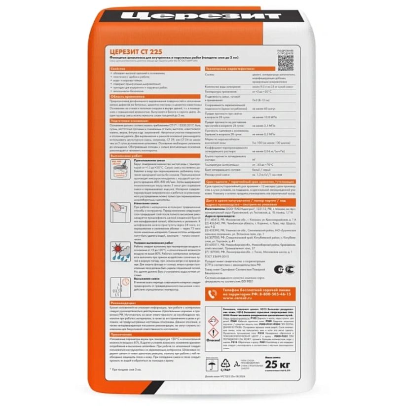 Шпатлевка известковая Ceresit CT 225 эффективна при ремонте трещин, раковин и других дефектов глубиной до 3 мм. CT 225 выпускается белого и серого цвета. Для заполнения дефектов большего размера следует использовать ремонтную штукатурку Ceresit CT 29.