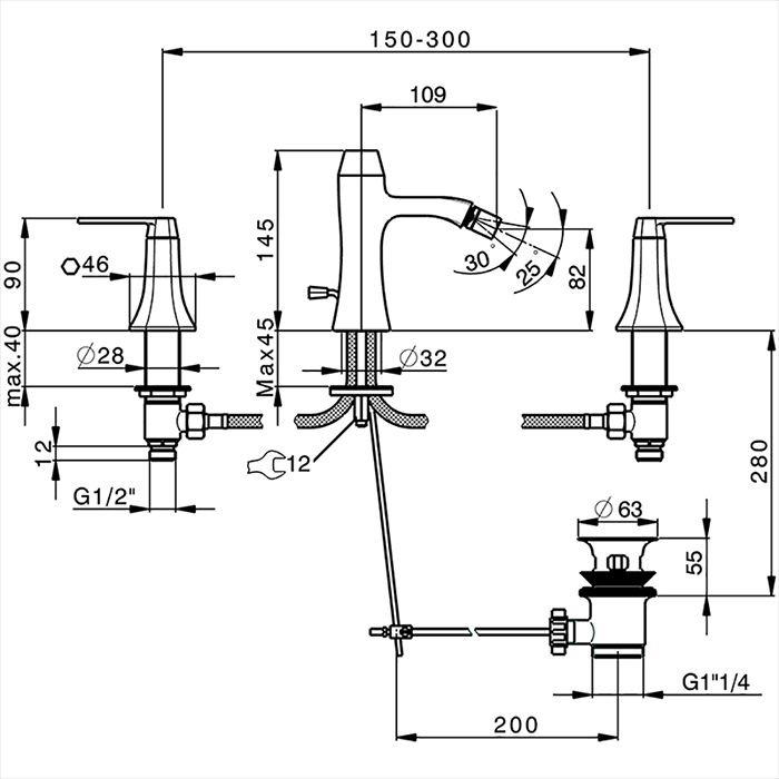 CISAL Cherie Смеситель для биде на 3 отверстия с донным клапаном, цвет хром/черный матовый