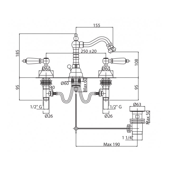 Смеситель для биде на три отверстия с донным клапаном, исполнение бронза, ручки бронза