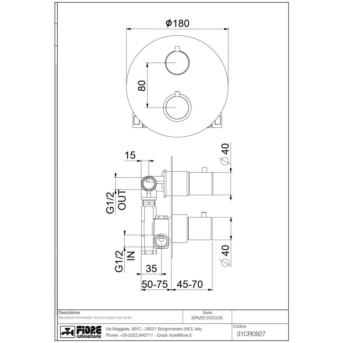 Смеситель для душа Fiore (Фиоре) X-Termo, встраиваемый в стену на 2 выхода, с термостатом (круглая панель и ручки), цвет хром 31CR0927